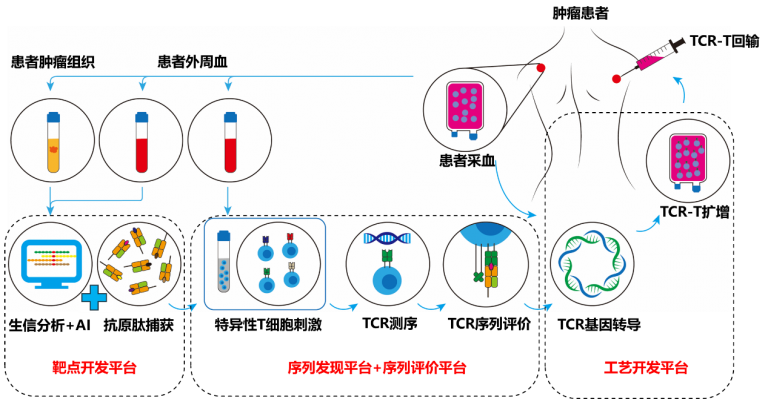 鼎成肽源通过自主搭建TCR技术平台,围绕如何正确选定靶点、精准靶向、系统评价以及释放T细胞的潜力建立了6大子平台,从靶点发现、序列发现、序列评价、工艺开发、功能增强到TCR蛋白药平台形成完整的闭环。